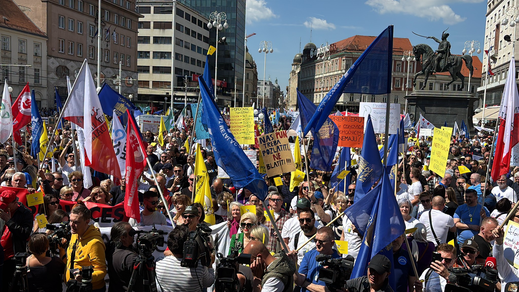U Zagrebu je 18. aprila 2026. godine održan veliki sindikalni protest pod sloganom „Hrvatska zajedno za veće plaće i mirovine“, u organizaciji tri sindikalne centrale i Sindikata penzionera. Na centralnom gradskom trgu okupilo se oko 70 hiljada radnika, penzionera i građana iz svih delova zemlje. Protest je organizovan kao odgovor...